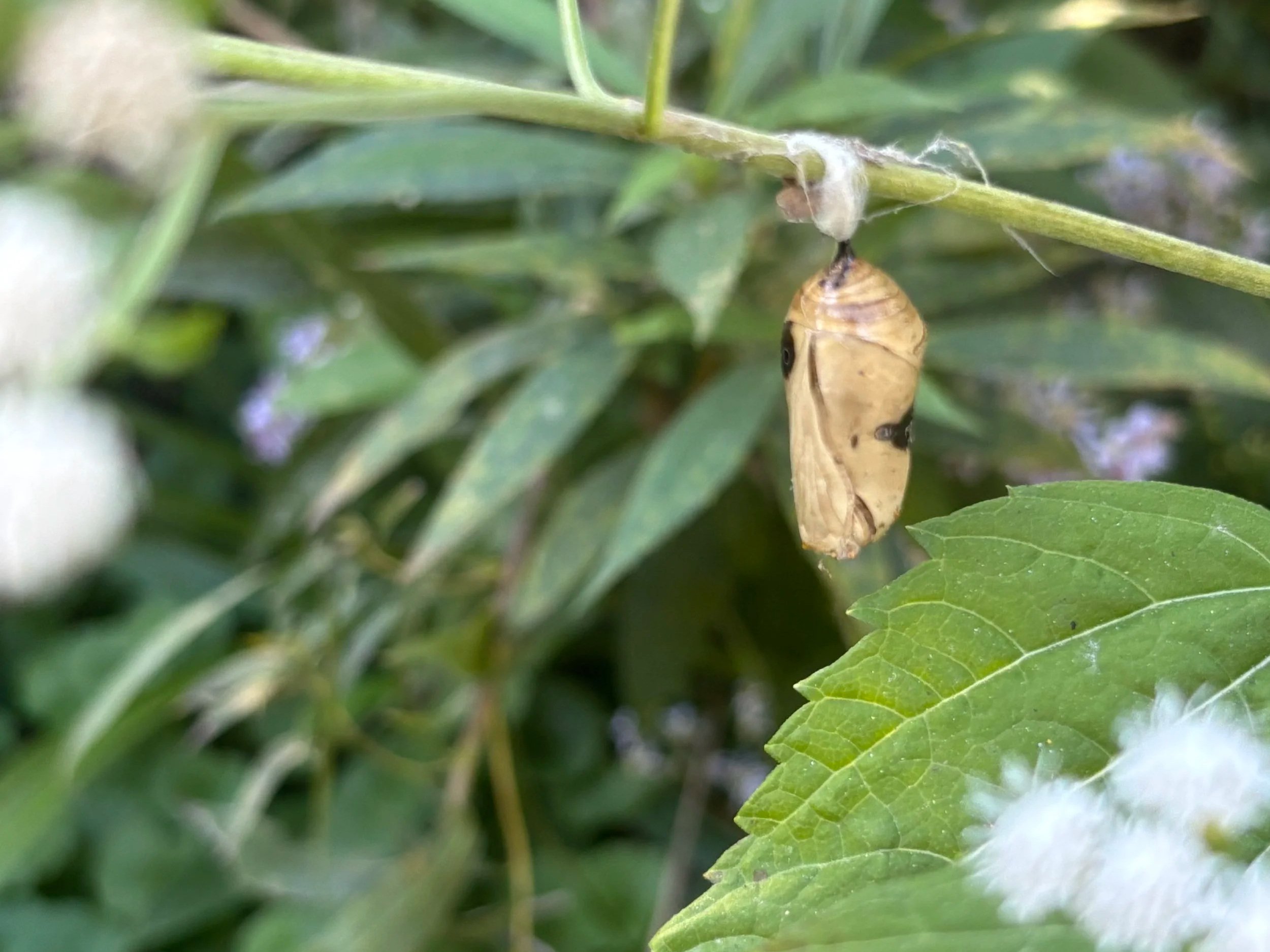 Scott's problem-solving skills were activated. He gently unhooked the tiny creature from the seat and scoped out the wild space around the courtyard. Surrounded by native foliage, he spotted a patch of wildflowers, soft and welcoming, yet sturdy with some October crisp, willing to secure this life into its next phase. Looking around, Scott borrowed some spider webs stretched along the shrubs and wrapped them securely away from harm. We had to protect the waiting.